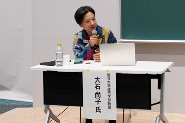 シンポジウムの最後のパネルディスカッションは、学会の理事でもある龍谷大学政策学部 大石 尚子教授がモデレーターを務め、入澤理事長と3大学連携の京都文教大学大学院臨床心理学研究科 濱野 清志研究科長、企業家研究・ソーシャル・イノベーション論が専門の東京都立大学大学院経営学研究科 高橋 勅徳准教授、生態人類学・環境民俗学が専門の琉球大学人文社会学部琉球アジア文化学科 高橋 そよ准教授が登壇。3人が研究内容を紹介した後、大会のテーマ「共生とソーシャル・イノベーション:人と社会の成長を問い直す」について5人で議論しました。